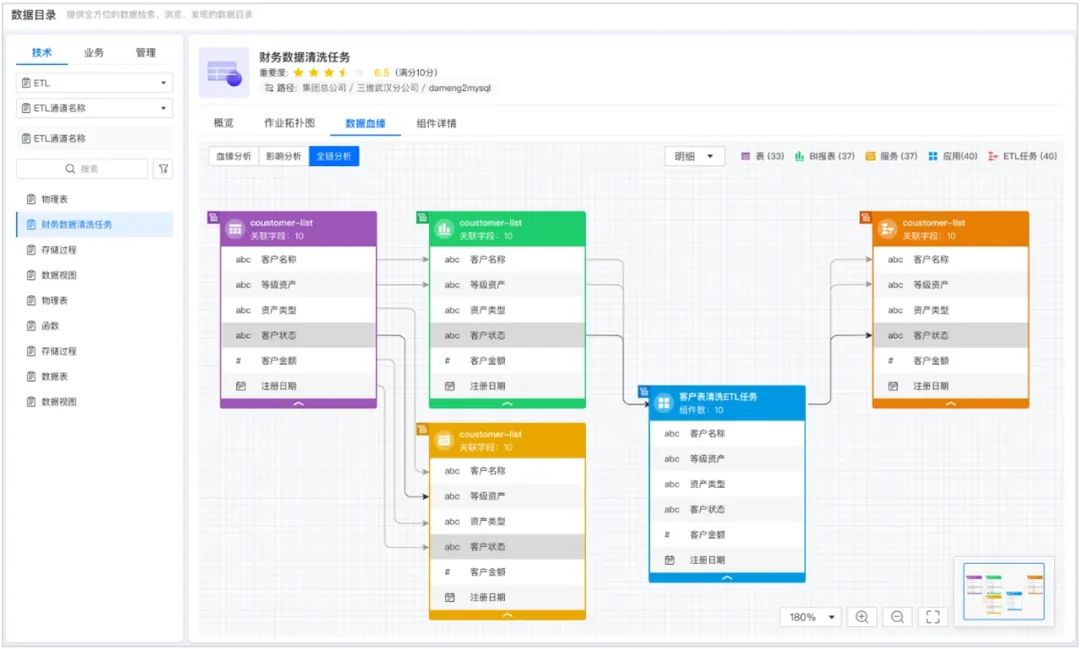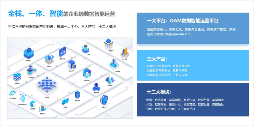 2023年10月26日,2023三維天地數(shù)據(jù)資產(chǎn)高峰論壇在北京成功舉辦。期間全新一代的數(shù)據(jù)資產(chǎn)管理平臺(DAM)v13正式與廣大用戶見面。 全新版DAM V13是基于客戶需求變化而進(jìn)行的一次功能迭代。平臺吸收了100+項目實施過程中用戶提出的重要需求,進(jìn)行統(tǒng)一歸納分析提煉,作為階段性需求進(jìn)行新功能開發(fā),新版本將更貼合項目實際使用場景,在工具化,自動化、智能化的方向走出堅實的一步,以更好地表達(dá)三維天地的產(chǎn)品對于企業(yè)數(shù)字化轉(zhuǎn)型的支撐價值。 產(chǎn)品新增了數(shù)據(jù)指標(biāo)、數(shù)據(jù)建模、數(shù)據(jù)標(biāo)簽、人工智能四大模塊,強化數(shù)據(jù)治理、提升用戶洞察力,加速數(shù)據(jù)價值快速轉(zhuǎn)化的工具支撐;持續(xù)以主動元數(shù)據(jù)為核心,結(jié)合機器學(xué)習(xí)、深度學(xué)習(xí)、自然語言處理技術(shù),對多模塊功能細(xì)節(jié)進(jìn)行匠心打磨,完善功能閉環(huán),功能點迭代數(shù)量80+,充分提升了智能化水平與數(shù)據(jù)管理效率。 在上一版本的基礎(chǔ)上,DAM V13平臺底座更夯實、數(shù)據(jù)治理更高效、數(shù)據(jù)開發(fā)更便捷、數(shù)據(jù)運營更智能,且擁有更標(biāo)準(zhǔn)及更為閉環(huán)的數(shù)據(jù)治理與智能數(shù)據(jù)分析解決方案。平臺具備搜索問答式數(shù)據(jù)分析系統(tǒng),問答式交互,搜索式體驗,將變革數(shù)據(jù)分析流程全場景的數(shù)據(jù)整合,讓數(shù)據(jù)“慧”說話;全鏈路協(xié)同的數(shù)據(jù)開發(fā)讓工具回歸為人服務(wù)的本質(zhì),全方位地提升一線數(shù)據(jù)開發(fā)人員/業(yè)務(wù)人員的工作效率。 DAM數(shù)據(jù)資產(chǎn)管理平臺是全棧、一體、智能的企業(yè)級數(shù)據(jù)智能運營平臺,形成了一大平臺、三大產(chǎn)品、十二大模塊的完整產(chǎn)品矩陣。主要包括治理、開發(fā)、分析三大產(chǎn)品,涵蓋數(shù)據(jù)目錄、數(shù)據(jù)標(biāo)準(zhǔn)、數(shù)據(jù)質(zhì)量、數(shù)據(jù)安全、數(shù)據(jù)開發(fā)、主數(shù)據(jù)建模、數(shù)據(jù)建模、指標(biāo)建模、標(biāo)簽建模、AI人工智能、BI商業(yè)智能、數(shù)據(jù)超市能等12大模塊,支持從數(shù)據(jù)治理到數(shù)據(jù)開發(fā)到數(shù)據(jù)分析的全鏈路的數(shù)據(jù)資產(chǎn)管理能力。 特性一:增強式數(shù)據(jù)目錄 傳統(tǒng)的數(shù)據(jù)資產(chǎn)目錄主要集中在結(jié)構(gòu)化數(shù)據(jù)庫表管理。而三維天地的數(shù)據(jù)目錄在此基礎(chǔ)上擴展了BI看板、ETL作業(yè)、主數(shù)據(jù)模型等類型,可以展示更多樣的數(shù)據(jù)對象,更細(xì)節(jié)的血緣關(guān)系,更及時的數(shù)據(jù)特征。 特性二:數(shù)據(jù)質(zhì)量的閉環(huán) 在以往項目實踐中,客戶不愁發(fā)現(xiàn)問題,而是更注重如何將發(fā)現(xiàn)的問題得以解決、將有問題的數(shù)據(jù)整改到位。因此平臺支持?jǐn)?shù)據(jù)質(zhì)量的事前、事中、事后的閉環(huán)管理,即事前需求和規(guī)則定義、事中質(zhì)量監(jiān)控以及事后量化分析和問題追溯。 特性三:治理到自助式敏捷應(yīng)用的閉環(huán) 平臺具備從數(shù)據(jù)治理到自助式敏捷應(yīng)用的閉環(huán)一體化管理。在資產(chǎn)平臺中,數(shù)據(jù)治理結(jié)束后,平臺具備商業(yè)智能、人工智能、指標(biāo)管理、標(biāo)簽畫像以及智能應(yīng)用等各模塊,以滿足用戶的個性化應(yīng)用的構(gòu)建。當(dāng)已有的應(yīng)用無法滿足訴求時,業(yè)務(wù)人員也可通過數(shù)據(jù)超市自助獲取數(shù)據(jù)、自助分析數(shù)據(jù)。實現(xiàn)治理到分析的全流程閉環(huán)應(yīng)用。 特性四:基于知識圖譜的增強數(shù)據(jù)治理 平臺結(jié)合AI、知識圖譜,有效提高了數(shù)據(jù)治理的效率,如業(yè)務(wù)域自動分類、數(shù)據(jù)標(biāo)準(zhǔn)自動生成、數(shù)據(jù)資產(chǎn)推薦、智能血緣推薦等,智能化的功能貫穿數(shù)據(jù)資產(chǎn)平臺的方方面面。 特性五:數(shù)據(jù)資產(chǎn)合理評估及入表 在數(shù)據(jù)資產(chǎn)入表的大背景下,產(chǎn)品適時推出自研的數(shù)據(jù)資產(chǎn)評估模型,通過對數(shù)據(jù)資產(chǎn)的成本因素、場景因素、市場因素和質(zhì)量因素等方面進(jìn)行多維分析評估,為數(shù)據(jù)資產(chǎn)合理定價及市場流通奠定基礎(chǔ)。 特性六:數(shù)據(jù)開發(fā)和治理一體化 企業(yè)在以往數(shù)據(jù)中臺的建設(shè)效果不顯著。全新平臺將數(shù)據(jù)治理的流程與數(shù)據(jù)開發(fā)的全生命周期深度融合,通過數(shù)據(jù)開發(fā)一體化,在數(shù)據(jù)標(biāo)準(zhǔn)驅(qū)動模型構(gòu)建基礎(chǔ)上,有序高質(zhì)量地進(jìn)行數(shù)據(jù)生產(chǎn),在數(shù)據(jù)開發(fā)過程中,完成數(shù)據(jù)治理。實現(xiàn)“標(biāo)準(zhǔn)即設(shè)計,設(shè)計即開發(fā),開發(fā)即治理”的開發(fā)治理一體化理念。 特性七:高效、輕量化的指標(biāo)建模 過去指標(biāo)的建設(shè),依賴開發(fā)人員手工編寫sql,業(yè)務(wù)人員用BI畫報表,不同人員對于業(yè)務(wù)指標(biāo)存在不同的理解,產(chǎn)生的結(jié)果各異,既不便于統(t