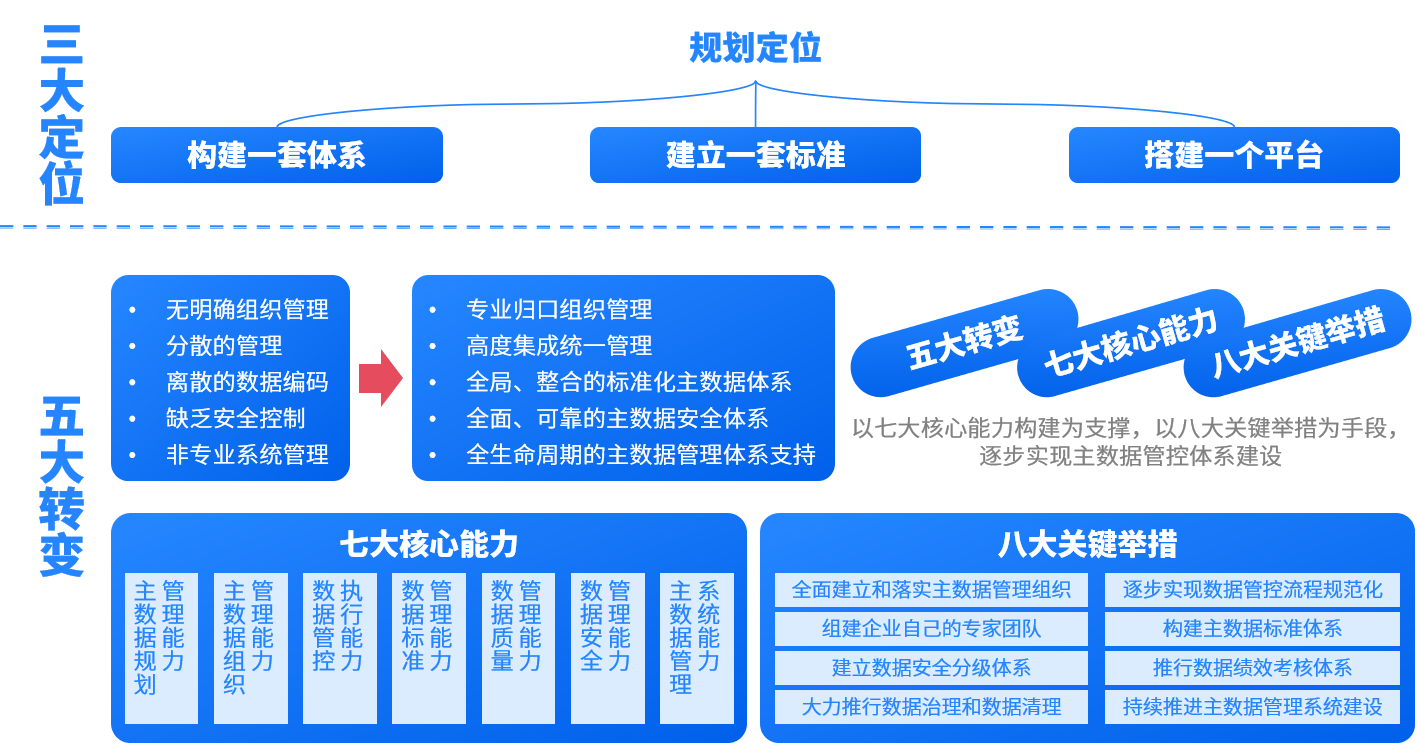 隨著該集團(tuán)業(yè)務(wù)的不斷擴(kuò)展,形成了綠色投資、工程服務(wù)、和高端制造三大業(yè)務(wù)板塊,各類(lèi)業(yè)務(wù)數(shù)據(jù)不斷增加累積,現(xiàn)已沉淀物料、組織機(jī)構(gòu)、員工、客戶(hù)、供應(yīng)商等基礎(chǔ)數(shù)據(jù)。集團(tuán)信息化需求和信息化建設(shè)在此期間也經(jīng)歷了一個(gè)從無(wú)到有、從簡(jiǎn)單到復(fù)雜的逐步深入的過(guò)程,從而使得一些需要在整個(gè)企業(yè)范圍內(nèi)各個(gè)系統(tǒng)中共享的基礎(chǔ)數(shù)據(jù)被分散到各個(gè)系統(tǒng)分別管理,導(dǎo)致公司的主數(shù)據(jù)在不同系統(tǒng)中編碼不一致,主數(shù)據(jù)管理缺乏一致性、準(zhǔn)確性、完整性。 在此情況下,該集團(tuán)積極配合國(guó)家能源發(fā)展、節(jié)能減排戰(zhàn)略規(guī)劃,立足于客戶(hù)需求,秉承“增產(chǎn)節(jié)能,效益型環(huán)保”理念,堅(jiān)持用科技的力量帶動(dòng)環(huán)保事業(yè)的發(fā)展,亟需建立一個(gè)主數(shù)據(jù)管理系統(tǒng),通過(guò)該系統(tǒng)固化相關(guān)數(shù)據(jù)管理流程和管理規(guī)范,以支撐數(shù)據(jù)標(biāo)準(zhǔn)體系的貫徹執(zhí)行,從而更好地實(shí)現(xiàn)信息資源的充分共享和最大化利用。 一、建體系 規(guī)劃和設(shè)計(jì)集團(tuán)主數(shù)據(jù)標(biāo)準(zhǔn)體系,明確組織分工、梳理管理流程、規(guī)劃藍(lán)圖方案,搭配切實(shí)可控的數(shù)據(jù)管理KPI體系,提升數(shù)據(jù)管理能力,實(shí)現(xiàn)主數(shù)據(jù)管理的體系化、標(biāo)準(zhǔn)化和平臺(tái)化。構(gòu)建一套完整的主數(shù)據(jù)管理體系框架,充分考慮企業(yè)的信息系統(tǒng)及主數(shù)據(jù)需求的實(shí)際情況。 二、定標(biāo)準(zhǔn) 制定主數(shù)據(jù)相關(guān)標(biāo)準(zhǔn)與規(guī)范,并通過(guò)數(shù)據(jù)清洗工作,提升數(shù)據(jù)質(zhì)量;根據(jù)主數(shù)據(jù)分類(lèi)明確相關(guān)管理組織以及職責(zé),制定物料主數(shù)據(jù)標(biāo)準(zhǔn)、管理流程和制度。 三、搭平臺(tái) 搭建集團(tuán)主數(shù)據(jù)管理平臺(tái),實(shí)現(xiàn)對(duì)主數(shù)據(jù)的全生命周期管理;依據(jù)主數(shù)據(jù)標(biāo)準(zhǔn)和主數(shù)據(jù)模型定義的規(guī)則進(jìn)行校驗(yàn)、清洗、發(fā)布,實(shí)現(xiàn)對(duì)主數(shù)據(jù)的全生命周期管理,并整合出統(tǒng)一的、可信任的主數(shù)據(jù)。 四、做共享 集成體系建設(shè),開(kāi)發(fā)一套與集團(tuán)及所屬企業(yè)相關(guān)應(yīng)用軟件的接口設(shè)計(jì)與集成主數(shù)據(jù)集成接口;通過(guò)統(tǒng)一和標(biāo)準(zhǔn)化物料主數(shù)據(jù),可以消除因物料編碼不一致所造成的集團(tuán)之間物料管理混亂和協(xié)同困難的情況,實(shí)現(xiàn)集團(tuán)之間信息的共享,進(jìn)一步實(shí)現(xiàn)物料的全生命周期跟蹤和追溯。 五、接運(yùn)維 建立一套主數(shù)據(jù)管理運(yùn)維體系,并通過(guò)知識(shí)轉(zhuǎn)移,培養(yǎng)集團(tuán)數(shù)據(jù)管理團(tuán)隊(duì)。制定基礎(chǔ)培訓(xùn)、應(yīng)用培訓(xùn)以及運(yùn)維培訓(xùn)、開(kāi)發(fā)培訓(xùn)計(jì)劃,針對(duì)本項(xiàng)目的基本情況宣貫、系統(tǒng)的基礎(chǔ)功能使用操作、日常運(yùn)維管理、管理員操作等基礎(chǔ)知識(shí)進(jìn)行培訓(xùn)。 通過(guò)本項(xiàng)目的建設(shè),確定集團(tuán)主數(shù)據(jù)體系建設(shè)的整體發(fā)展思路為“以七大核心能力構(gòu)建為支撐,以八大關(guān)鍵舉措為手段,逐步實(shí)現(xiàn)主數(shù)據(jù)管控體系建設(shè)”。即在進(jìn)行主數(shù)據(jù)規(guī)劃管理能力、數(shù)據(jù)組織管理能力、數(shù)據(jù)管控執(zhí)行能力、數(shù)據(jù)標(biāo)準(zhǔn)管理能力、數(shù)據(jù)質(zhì)量管理能力、數(shù)據(jù)安全管理能力、主數(shù)據(jù)管理系統(tǒng)能力“七大核心能力”建設(shè)的基礎(chǔ)上,制定今后集團(tuán)主數(shù)據(jù)體系的各項(xiàng)發(fā)展目標(biāo),并通過(guò)主數(shù)據(jù)管理組織固化、專(zhuān)家團(tuán)隊(duì)建設(shè)、主數(shù)據(jù)標(biāo)準(zhǔn)體系構(gòu)建、主數(shù)據(jù)治理和主數(shù)據(jù)清理、主數(shù)據(jù)管控流程標(biāo)準(zhǔn)、主數(shù)據(jù)安全分級(jí)體系、主數(shù)據(jù)績(jī)效考核和主數(shù)據(jù)管理系統(tǒng)建設(shè)等“八大關(guān)鍵舉措”,保障主數(shù)據(jù)體系規(guī)劃內(nèi)容的落實(shí)和實(shí)施。 三維天地通過(guò)本期主數(shù)據(jù)項(xiàng)目建設(shè),促進(jìn)了該集團(tuán)物料數(shù)據(jù)共享率的提高,進(jìn)而使得構(gòu)建全集團(tuán)范圍內(nèi)的“物資管理中心模式”成為可能;通過(guò)主數(shù)據(jù)管理實(shí)現(xiàn)了數(shù)據(jù)的標(biāo)準(zhǔn)化、一致性和準(zhǔn)確性,提高了數(shù)據(jù)質(zhì)量;減少了重復(fù)數(shù)據(jù)、錯(cuò)誤數(shù)據(jù)和不完整數(shù)據(jù)的出現(xiàn),提高了數(shù)據(jù)的可用性和可靠性。 主數(shù)據(jù)管理使得該集團(tuán)能夠更好地整合和管理各個(gè)二級(jí)單位的數(shù)據(jù),從而提高了業(yè)務(wù)流程的效率;通過(guò)統(tǒng)一的數(shù)據(jù)源,減少了數(