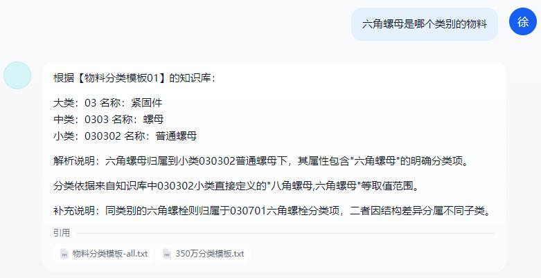 智能問答交互:用戶只需通過自然語言輸入問題(如“查詢類別為xxx的標(biāo)準(zhǔn)定義”、“根據(jù)物料長描述xxx推薦物料分類”),系統(tǒng)自動(dòng)解析問題并精準(zhǔn)匹配知識(shí)庫中的物料標(biāo)準(zhǔn)信息,無需復(fù)雜操作。