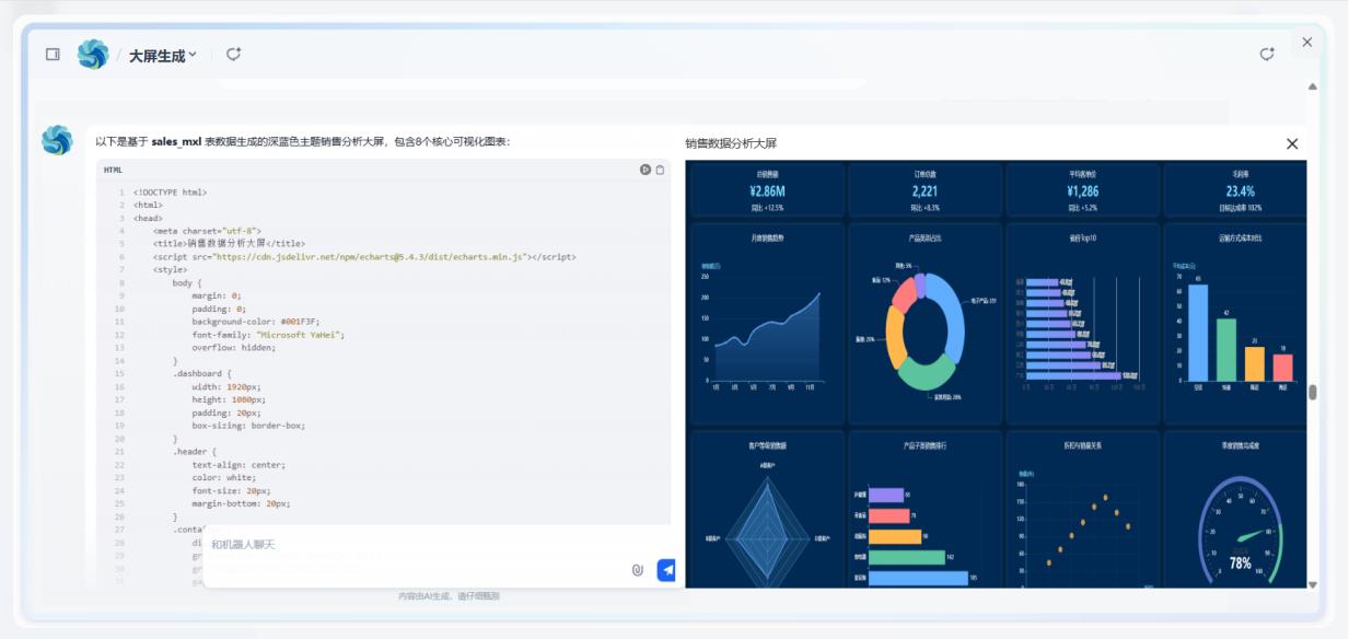 應(yīng)用于數(shù)據(jù)分析大屏智能體,可根據(jù)用戶問(wèn)題,調(diào)用數(shù)據(jù)計(jì)算分析工具,代碼生成工具,精準(zhǔn)生成完整的數(shù)據(jù)大屏應(yīng)用,大幅提升開發(fā)效率,使數(shù)據(jù)可視化開發(fā)更智能高效。
