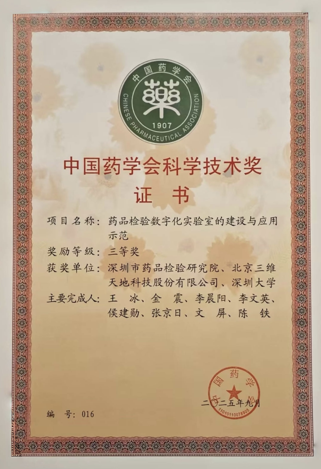 在近日成都盛大召開的2025年中國藥學(xué)大會(huì)上,一項(xiàng)標(biāo)志著我國藥品檢驗(yàn)數(shù)字化轉(zhuǎn)型里程碑的成果受到矚目。由深圳市藥品檢驗(yàn)研究院牽頭,聯(lián)合北京三維天地科技股份有限公司共同完成的“藥品檢驗(yàn)數(shù)字化實(shí)驗(yàn)室的建設(shè)與應(yīng)用示范”項(xiàng)目,憑借其顯著的技術(shù)創(chuàng)新性與行業(yè)示范價(jià)值,榮膺第二十屆中國藥學(xué)會(huì)科學(xué)技術(shù)獎(jiǎng)三等獎(jiǎng)。