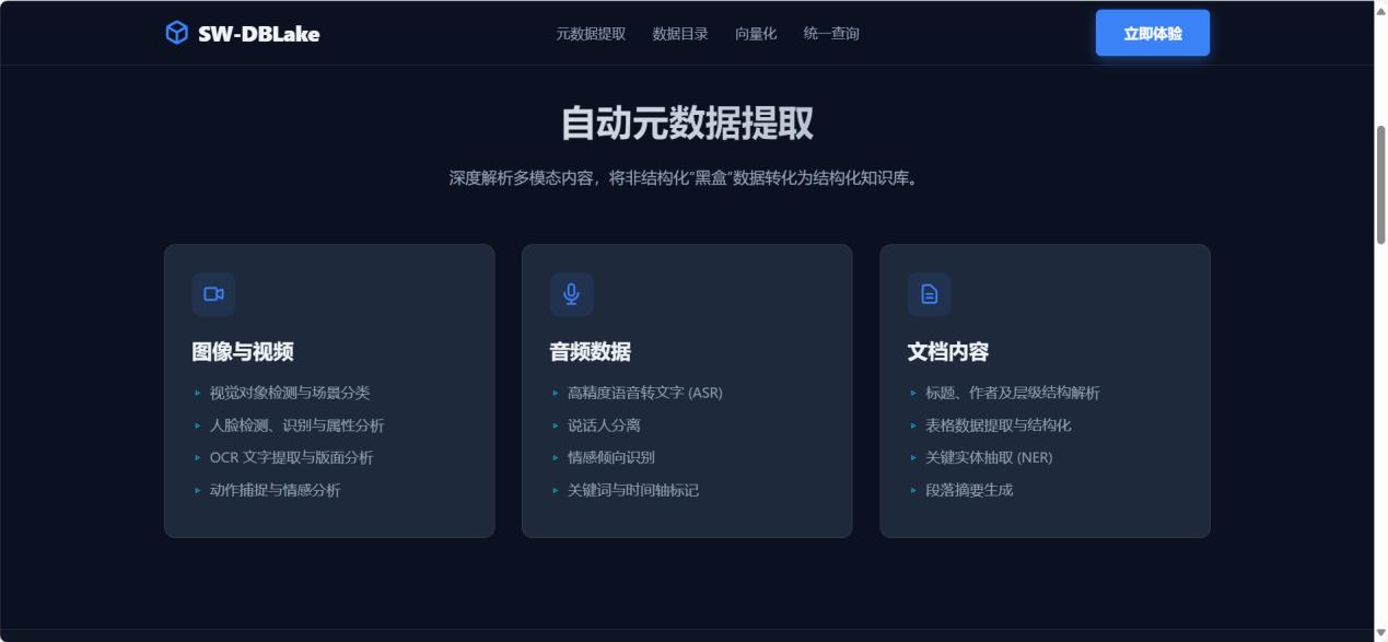 面對這一行業(yè)核心痛點,三維天地以下一代數(shù)據(jù)架構(gòu)為藍(lán)圖,正式發(fā)布顛覆性的多模態(tài)數(shù)據(jù)湖產(chǎn)品:SW-DBLake。該產(chǎn)品旨在為企業(yè)構(gòu)建統(tǒng)一、高效、AI原生的多模態(tài)數(shù)據(jù)管理基座,使企業(yè)從繁瑣的數(shù)據(jù)治理工作中解脫出來,更專注于智能應(yīng)用本身的價值創(chuàng)造。